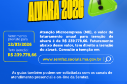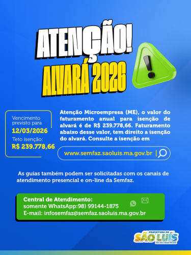 A Secretaria Municipal da Fazenda (Semfaz) já disponibilizou as guias para pagamento das taxas de licença e de verificação fiscal de localização e funcionamento – Alvará válido para o ano de 2026. O documento já está disponível para emissão no site da secretaria, por meio do endereço eletrônico www.semfaz.saoluis.ma.gov.br, com vencimento previsto para o dia 12 de março de 2026. Para realizar a emissão, é necessário ter em mãos o CNPJ da empresa.